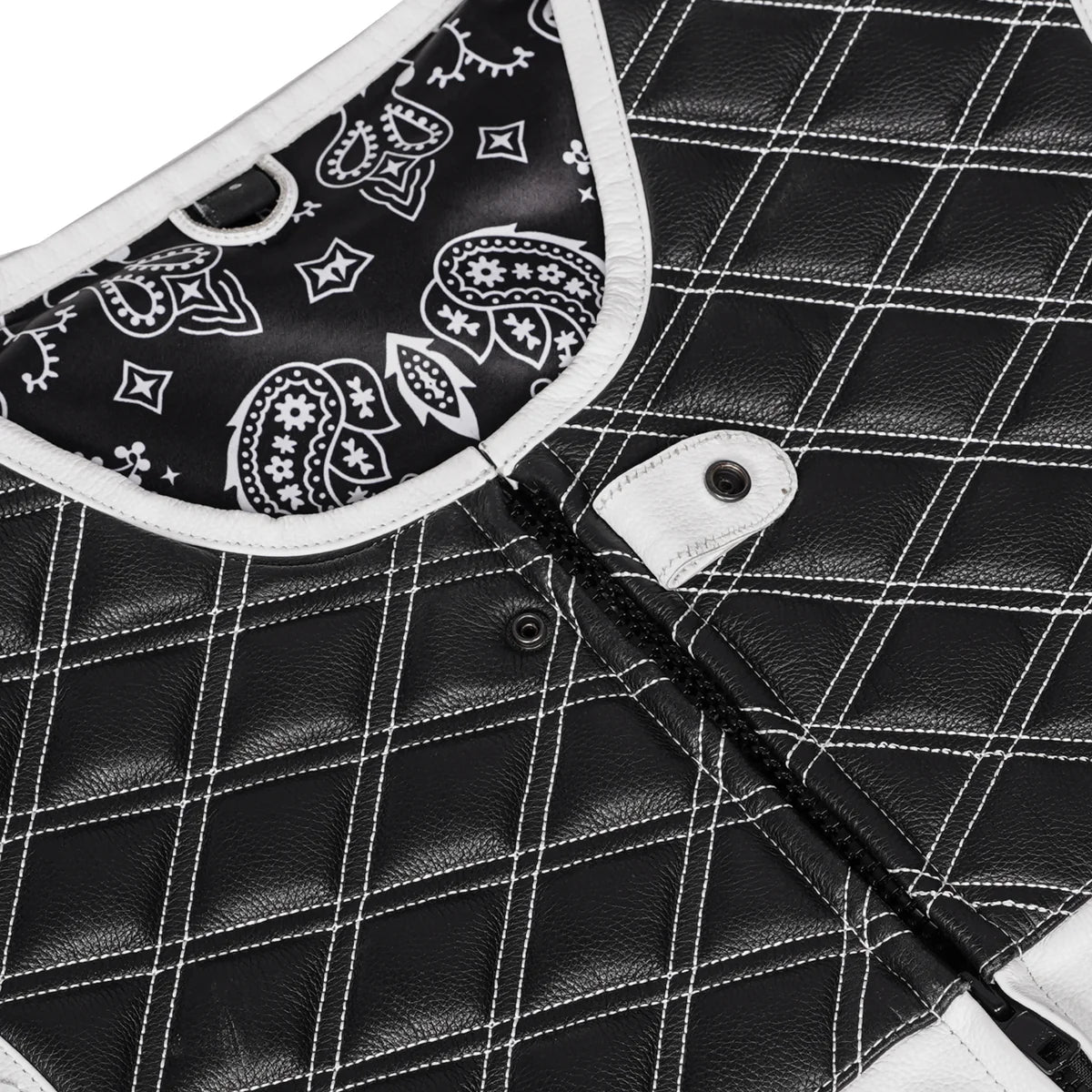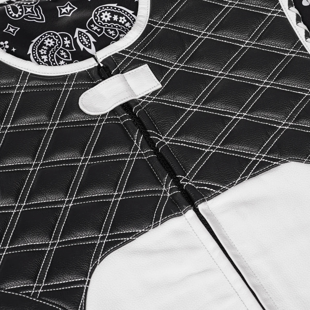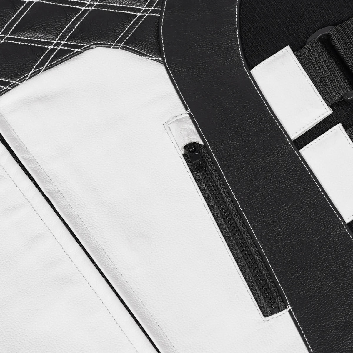 - White leather neck piping enhances structure with a clean, biker-ready finish