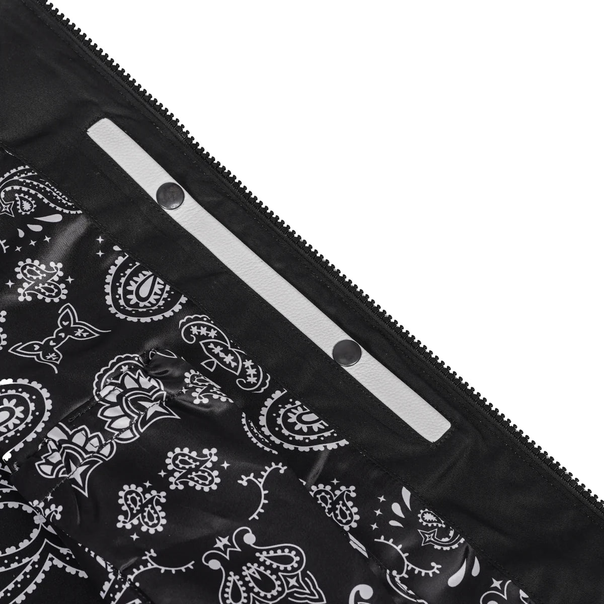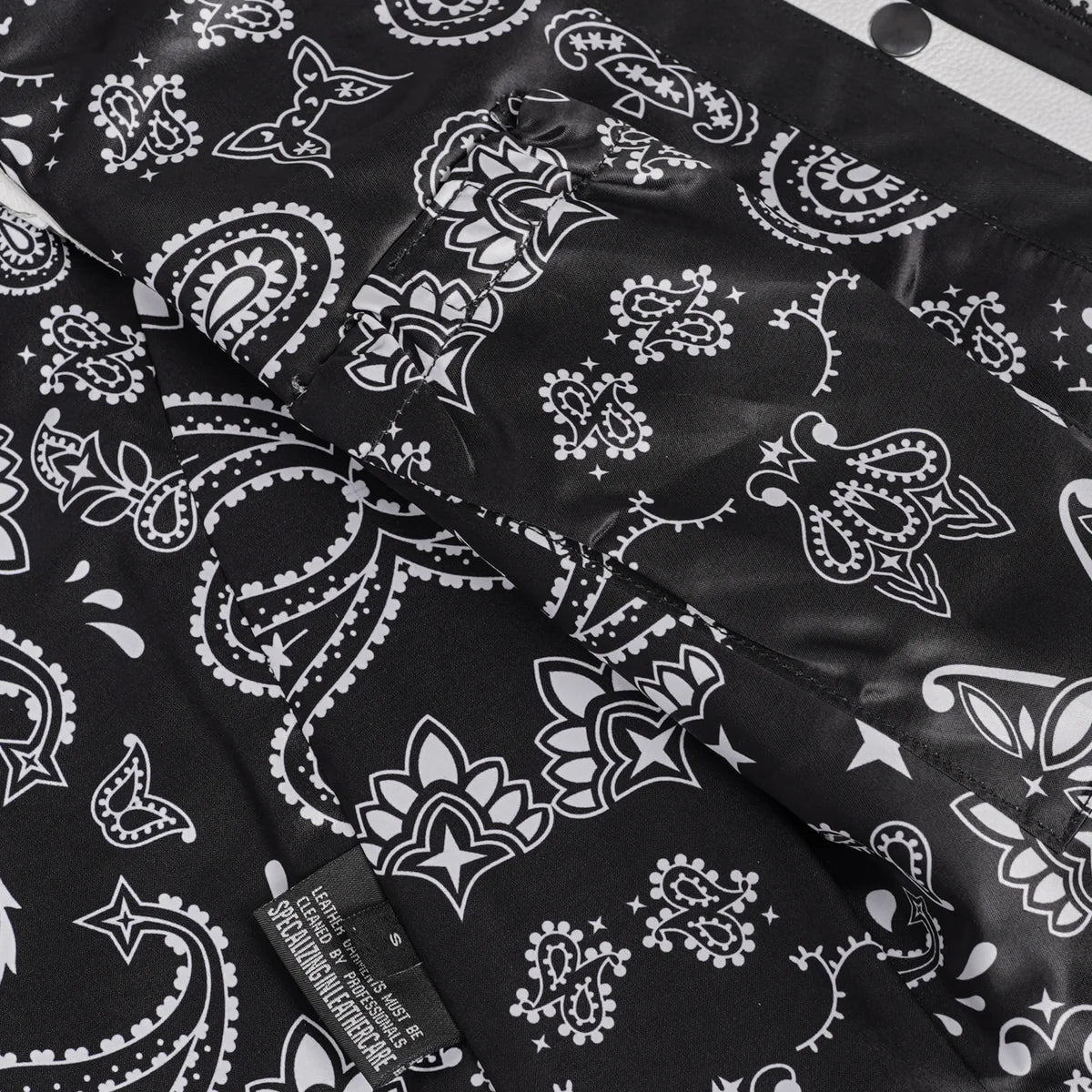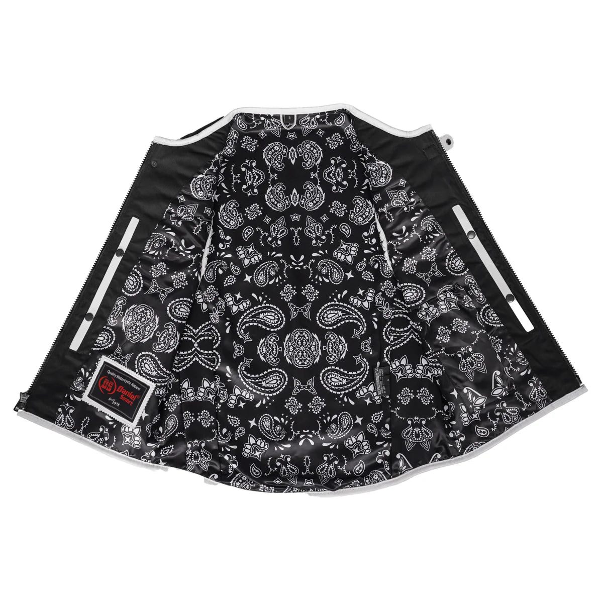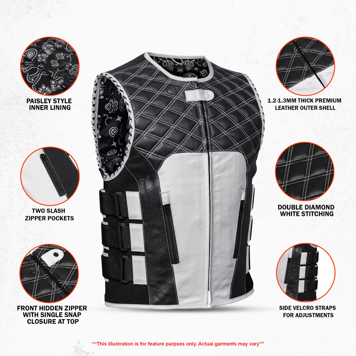 - White leather neck piping enhances structure with a clean, biker-ready finish