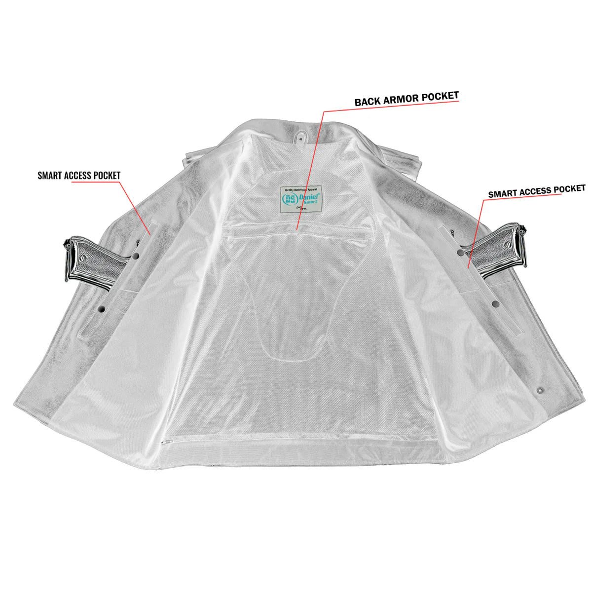 - 2 inside Conceal Carry pockets equipped with a double magazine holster for storing safety tools.