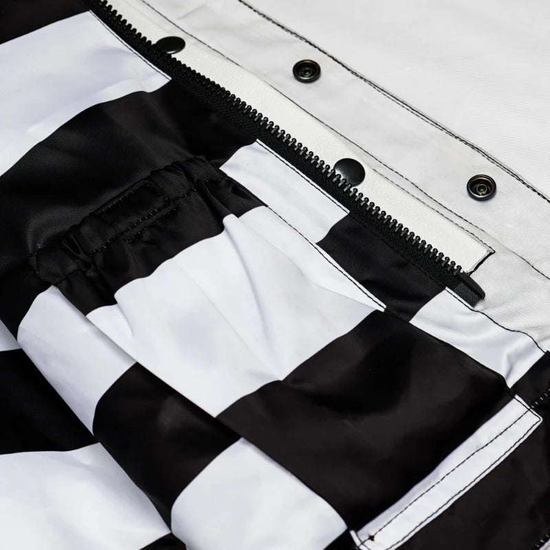 - Front opening, heavy-duty YKK zipper, hidden under the snap placket.